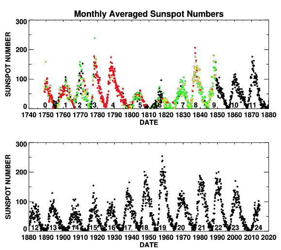 In 1844, Schwabe found that sunspots appear in cycles of about 11 years, a discovery confirmed by other astronomers. This led to the creation of the International Sunspot Number (R), which measures individual sunspots and groups. Since 1849, R is calculated as an average from various observatories around the world.
