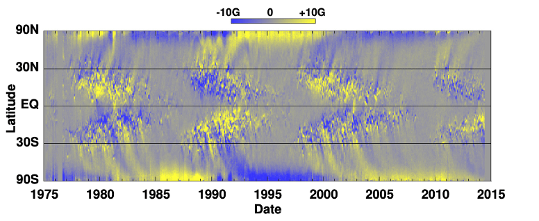 Besides optical observations, a magnetogram can be created by analyzing the magnetic flux on the solar surface. The analysis maps the magnetic flux onto the sun. This method also allows for the observation of sunspots due to their strong vertical magnetic fields. A common way to study their distribution over time is through the “Butterfly diagram.” This diagram shows the characteristic butterfly pattern of sunspots. They appear at higher latitudes at the start of a solar cycle and move toward the equator by the end. The strong magnetic fields at the poles indicate that their polarity reverses at the solar maximum (D. H. Hathaway, 2015).