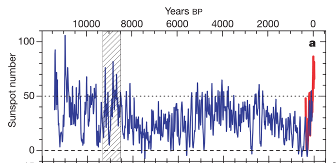 Besides the Schwabe Sunspot Cycle, solar activity changes over different timescales. There are short-term modulations in gamma-ray flare activity every 154 days (Rieger et al., 1984) and about two-year variations (Benevolenskaya, 1995). Additionally, researchers studying solar effects on climate have identified longer cycles. By analyzing radioactive isotopes in tree-rings and ice cores, they found that solar activity can be traced back to the end of the last ice age (S. K. Solanki, Usoskin, Kromer, Schussler, & Beer, 2004). They showed, that the high level of solar activity in the second half of the 20th century was unusual compared to the previous 10,000 years.
