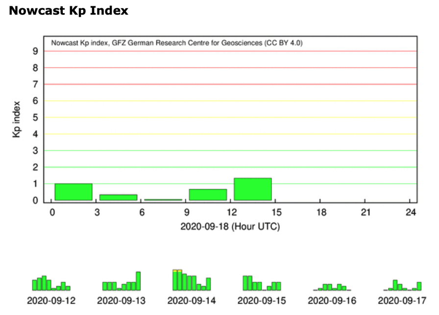 The Kp-Index measures short-term changes in the Earth’s horizontal magnetic field. It is based on the aa-Index, which shows geomagnetic field strength. It is calculated every three hours from data collected at 13 magnetic observatories. The Kp-Index measures only fluctuations, not absolute values, as the usual quiet-day variation has been removed. These changes show irregular disturbances in the geomagnetic field caused by interactions with solar wind. Low Kp values signify calm geomagnetic conditions, while values of 5 or above show a geomagnetic storm.