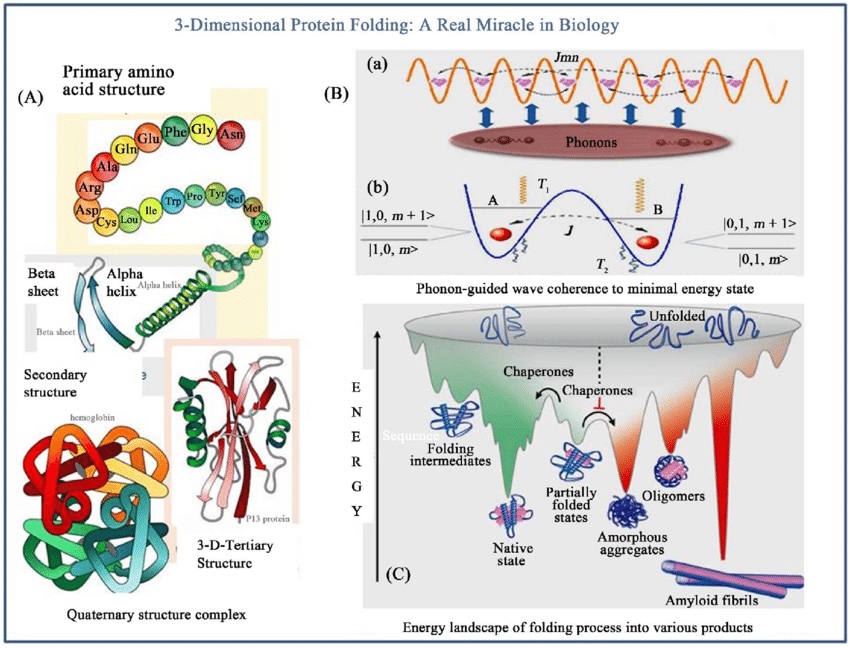 RIGHT : Illustration of protein folding processes and the influence of phonons (vibrational waves) in maintaining structural coherence. Image source: ResearchGate (Meijer & Geesink, 2018)