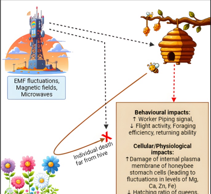 LEFT: Diagram showing how electromagnetic radiation from power lines and wireless sources may impact bee behavior and colony dynamics. Image source: SafeEMR.com